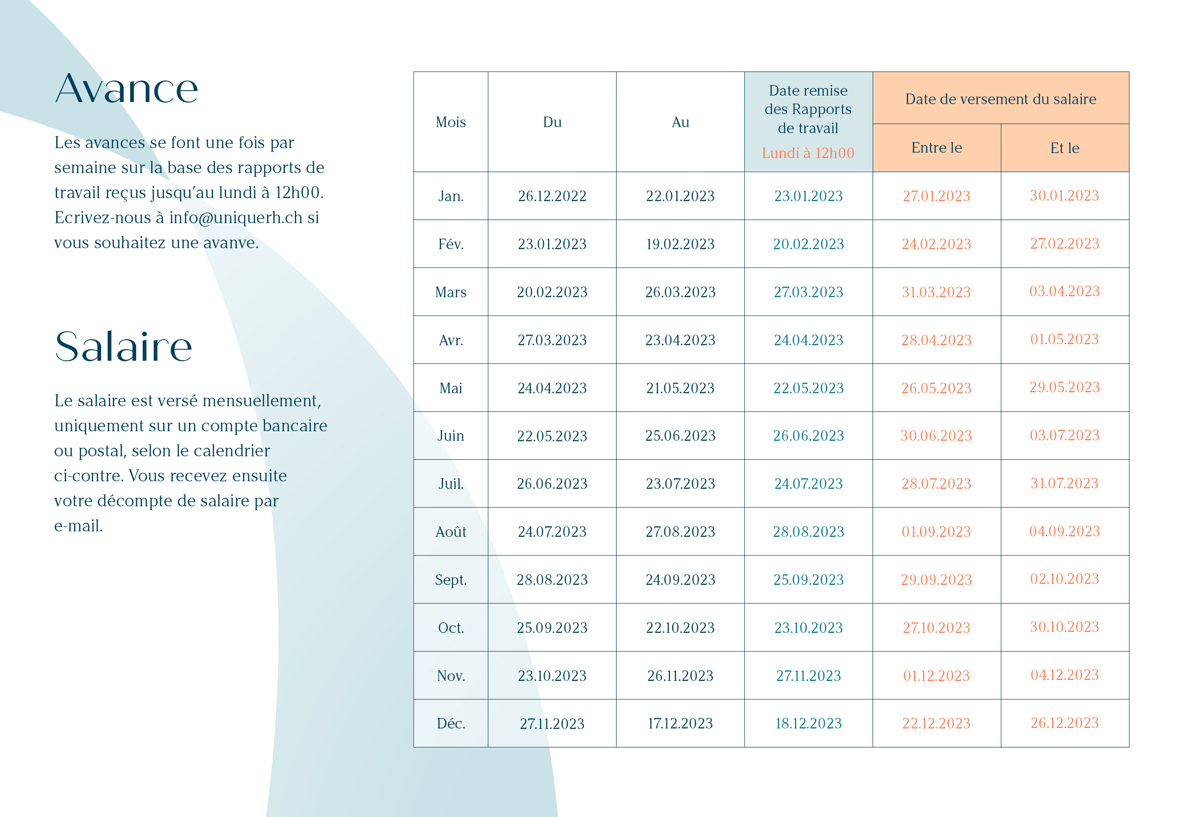 Nous vous recommandons de télécharger le calendrier des salaires, qui vous aidera à soumettre vos rapports d’heures dans les délais appropriés. Vous pourrez l’imprimer ou le conserver sur vos appareils électroniques pour une consultation rapide et facile à tout moment.